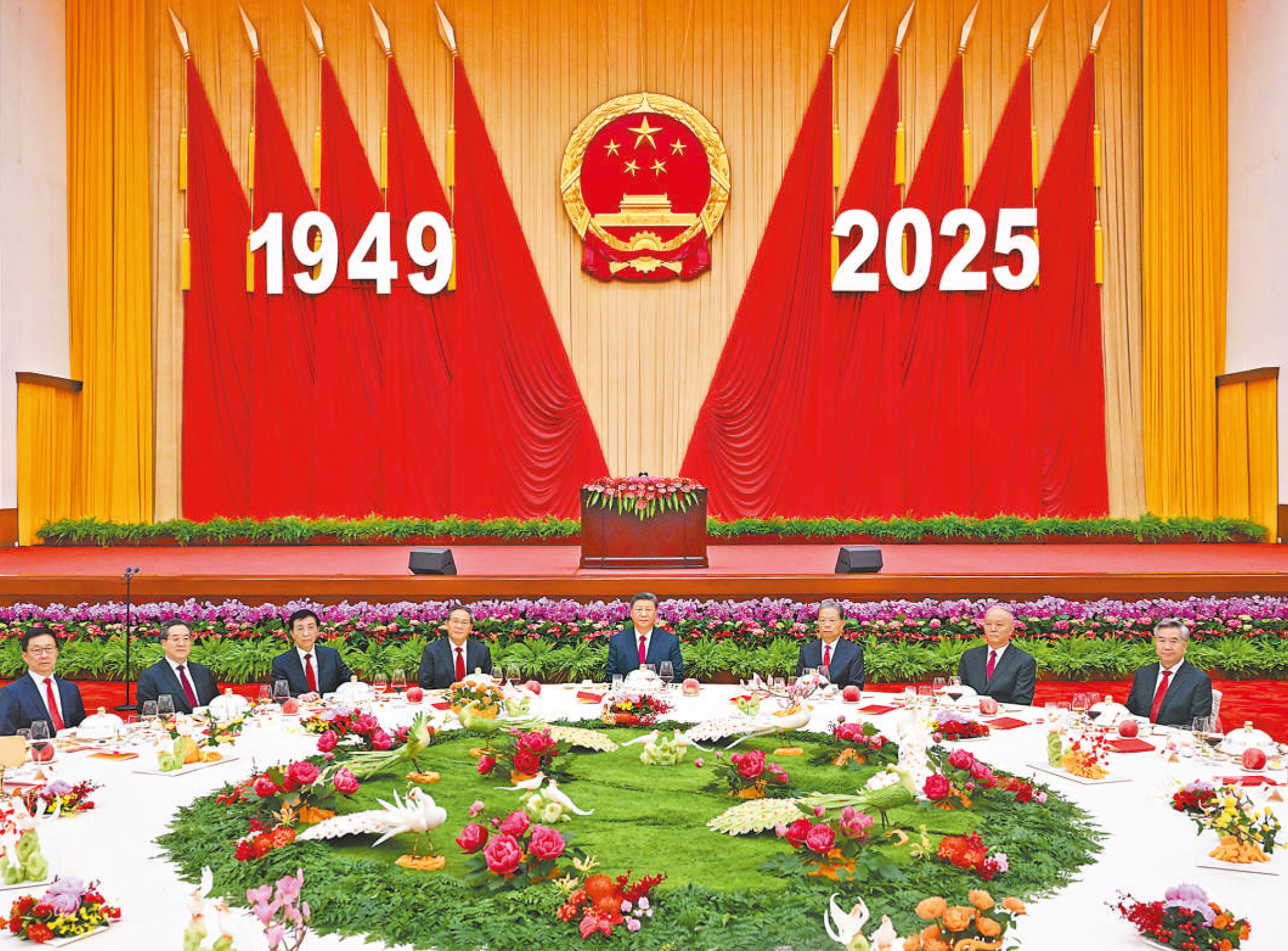 ཟླ་9ཚེས་30ཉིན་གྱི་དགོང་མོར། ཞི་ཅིན་ཕིང་དང་། ལི་ཆང་། ཀྲའོ་ལེ་ཅི། ཝང་ཧུའུ་ཉིང་། ཚའེ་ཆི། ཏིང་ཤུའེ་ཞང་། ལི་ཞི། ཧན་ཀྲེང་སོགས་ཏང་དང་རྒྱལ་ཁབ་ཀྱི་འགོ་ཁྲིད་པས་ཀྲུང་ཕྱིའི་མི་སྣ་དང་དགའ་འཛོམས་གནང་སྟེ། ཀྲུང་ཧྭ་མི་དམངས་སྤྱི་མཐུན་རྒྱལ་ཁབ་ཀྱི་འཁྲུངས་སྐར་ལ་ལྷན་དུ་རྟེན་འབྲེལ་ཞུས་པ།